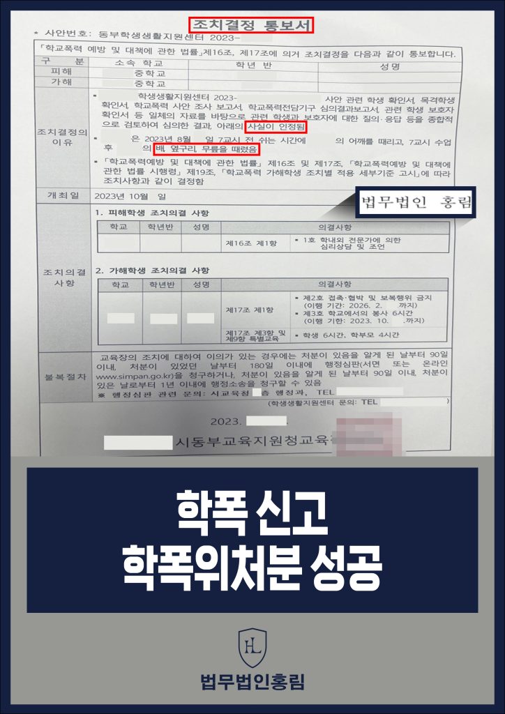 그 결과 학폭위에서는 가해 학생들에게 조치 처분이 내려졌고, 형사 고소를 통해 주동자들을 폭행죄 혐의로 소년부 송치시키는 성과를 거두었습니다.